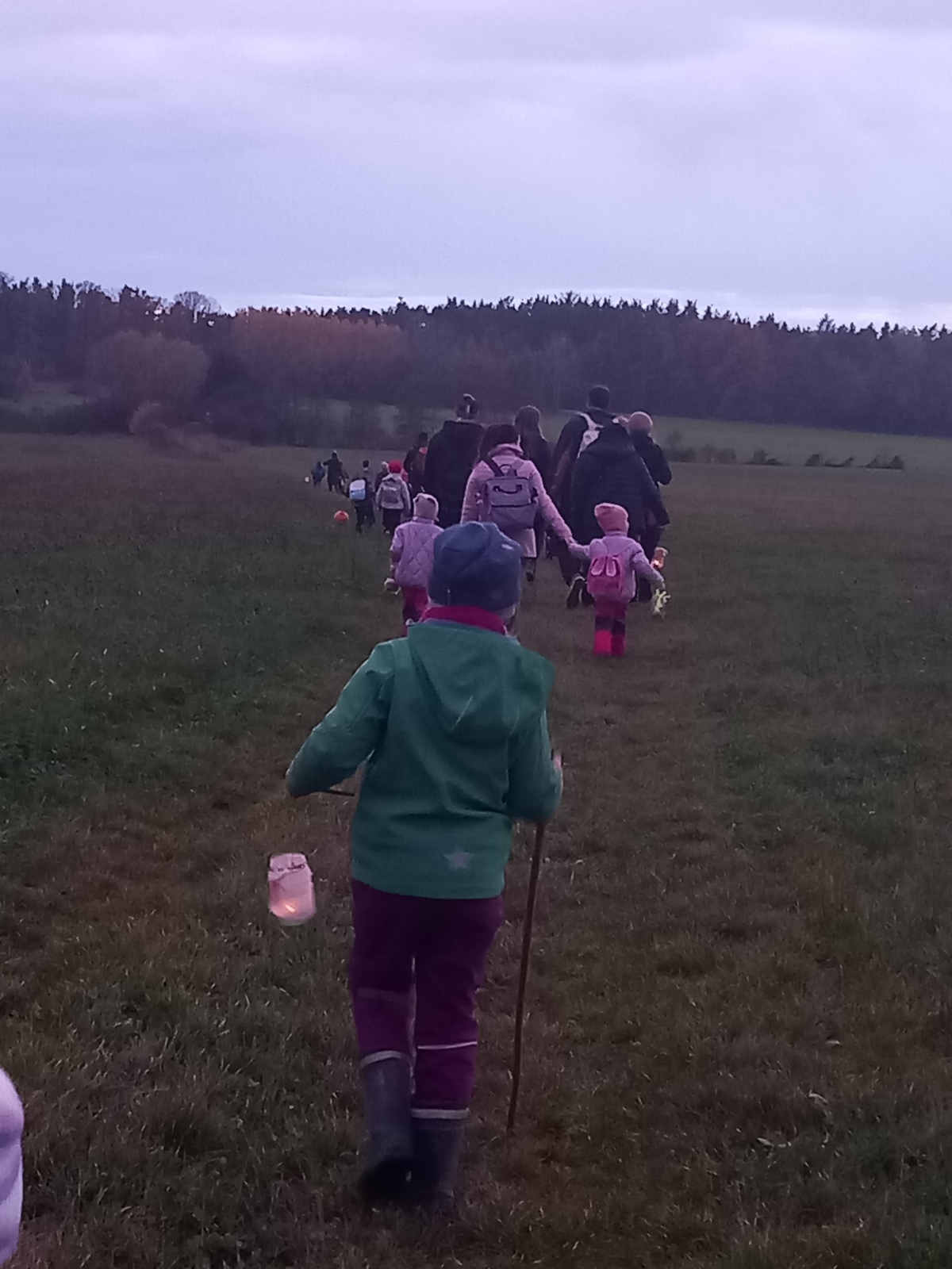Od školy jsme vyrazili pohromadě v početné skupině. Úzká cesta polem však rozmělnila skupinu do dlouhé řady. Rozestupy nabíraly na velikosti a zatím co někteří už byli na zpevněné cestě k hospodě na hřišti, jiní se teprve dostali k lesu. Světélka se mihotala po celé délce lesa a vzbuzovala zdání, že se k lesu vydala celá vesnice.