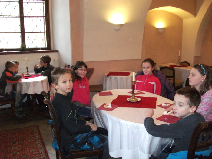 Na závěr letošního roku jsme se vydali do Potštejna na hraný příběh narození Ježíška v interiérech zámku. Tento vzdělávací vánoční program jsme ukončili v zámecké cukrárně, kde pro nás byl přichystán teplý zámecký čaj a vánoční cukroví. Posezení dokreslil zvuk koled a do krojů oblečená obsluha zámecké cukrárny.